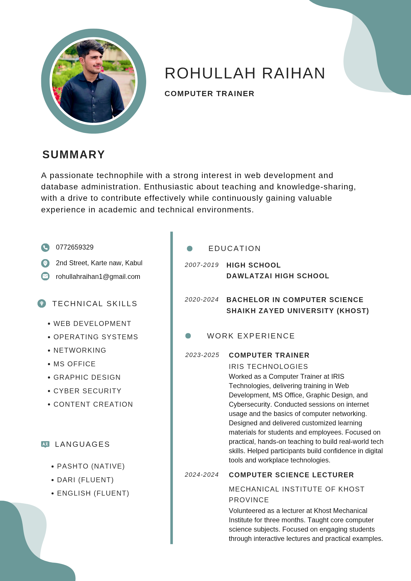Hire MeI am a skilled full-stack developer with experience working as a Computer Trainer at IRIS Technologies in Kabul and Khost. I specialize in creating responsive websites, web applications, and technical solutions. I'm now offering my services on Fiverr to help clients globally.